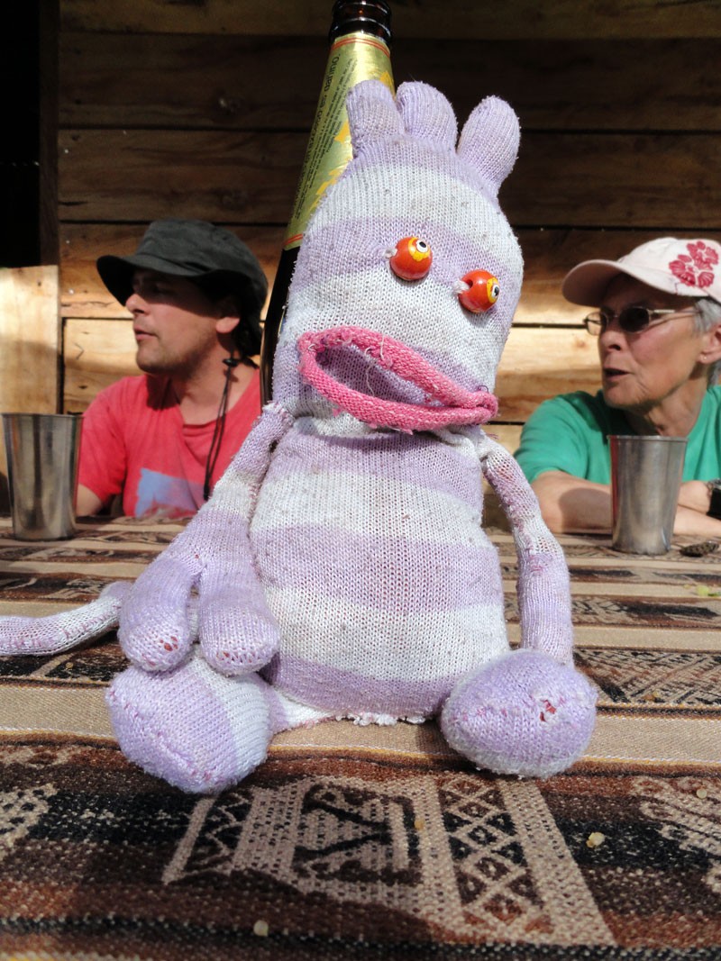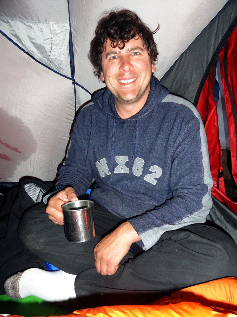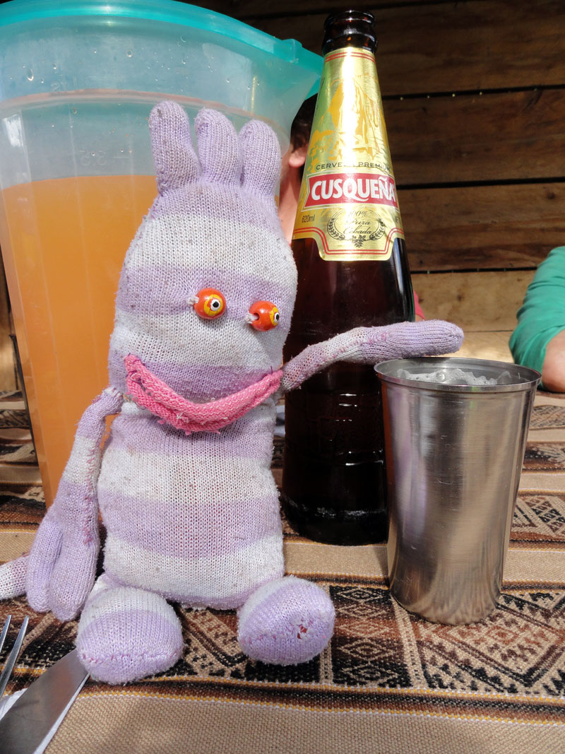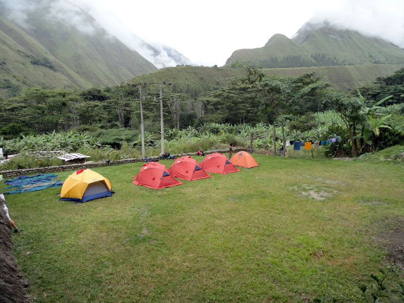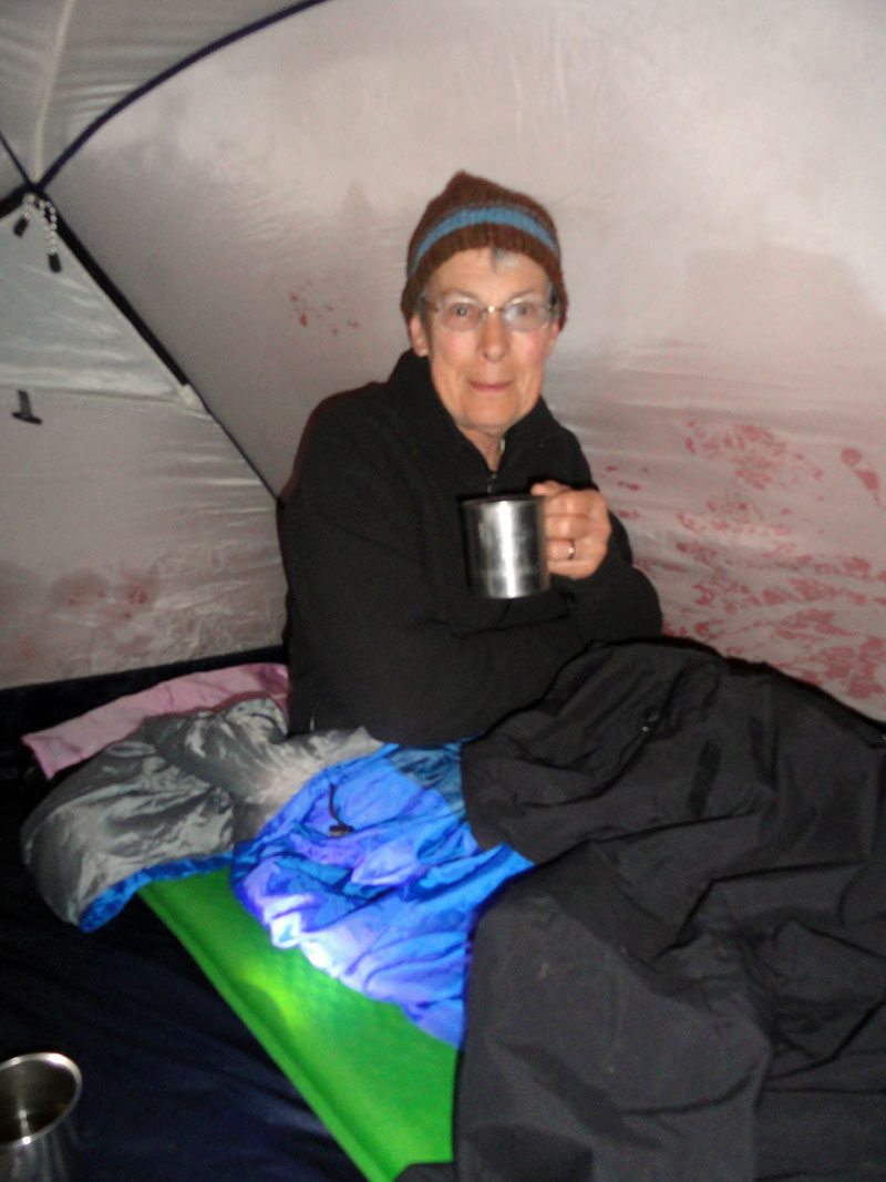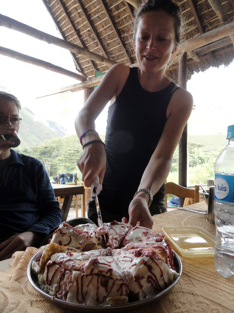 Los chefs prepararon una cena muy rico, pero fue demasiado comida y todos estábamos cansados y por eso después de poco comida y vino por supuesto, y unas historias de Juan sobre un “oso de anteojos” y muchas cuentas sobre fantasmas, regresamos a nuestras carpas. Antes de dormir, verifiqué con Jane. Ella no fue bien pero todavía ¡estaba viva!  Mi mamá y yo compartimos una carpa pero después de mirar a mis fotos del día en mi camera, nos quedamos dormidas muy rápidamente. Arlo me hubo traído su bolsa de dormir así como una colchoneta por eso estaba muy cómoda y también no necesité toda la ropa hube llevado más temprano.