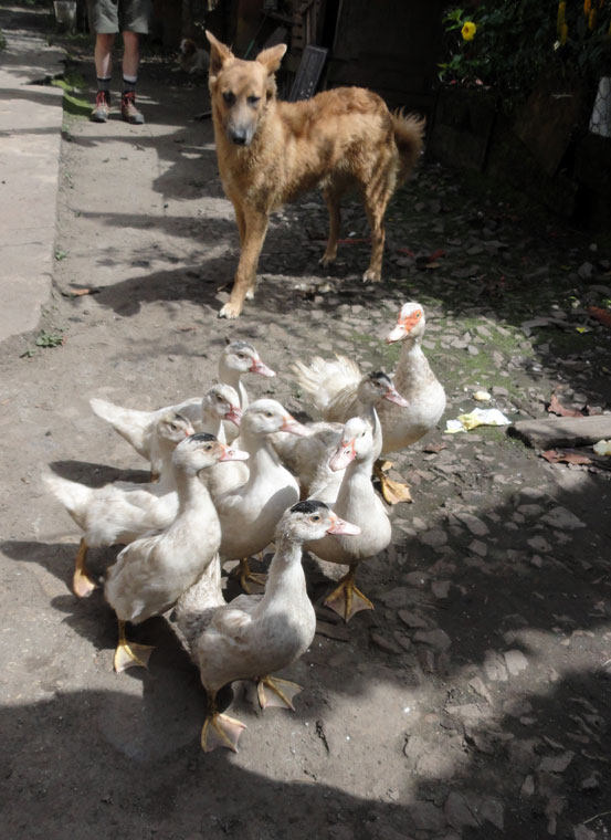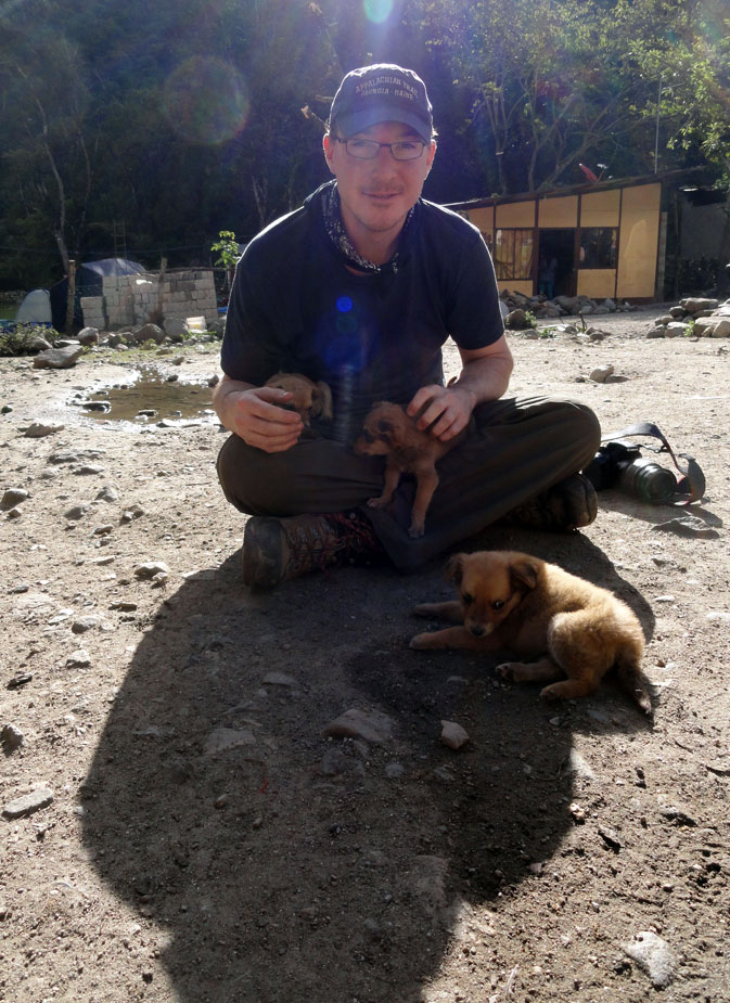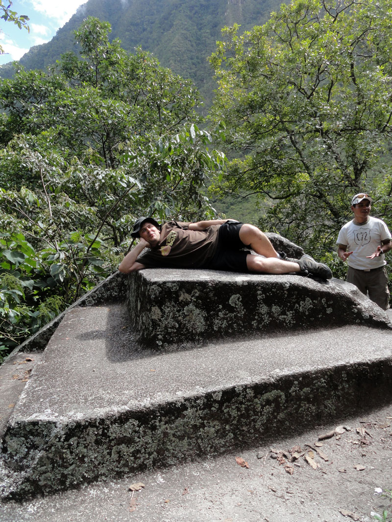 La mañana siguiente (viernes), hubimos mucho tiempo por eso Matthew y yo jugamos fútbol y a veces Jane, Arlo y Juancito nos unieron.  Yo fui el portero por supuesto.  El día 4, pienso que el plan fue para caminar a Hidroeléctrico, pero pienso que Juancito ya hubiera decido que nuestro grupo fue demasiado despacio y quizás demasiado cansado también, por eso la camioneta nos tomó a nuestro parado en Hidroeléctrico.  Almorzamos más temprano de usual  y después de poca actividad  pero como siempre la comida de Raúl fue rico y todos nosotras estábamos satisfechos.  Mientras Raúl y Pedro preparaban el almuerzo, Juan nos llevó visitar unas ruinas de los incas – no fueron muy estupendas pero fue alguna cosa para hacer y un perro nos acompañó que fue muy lindo.