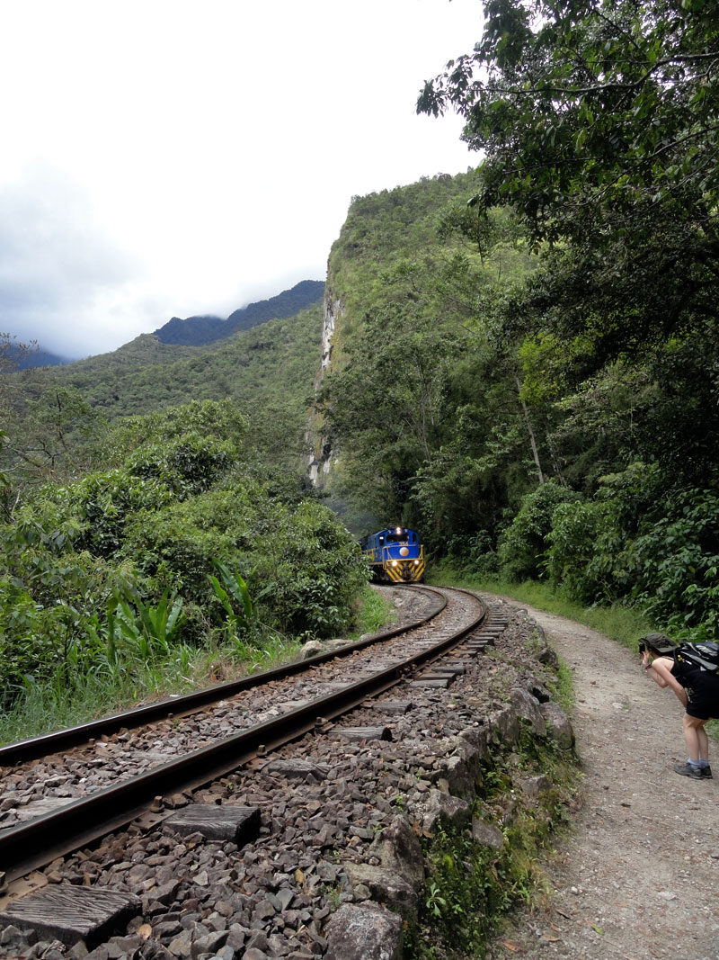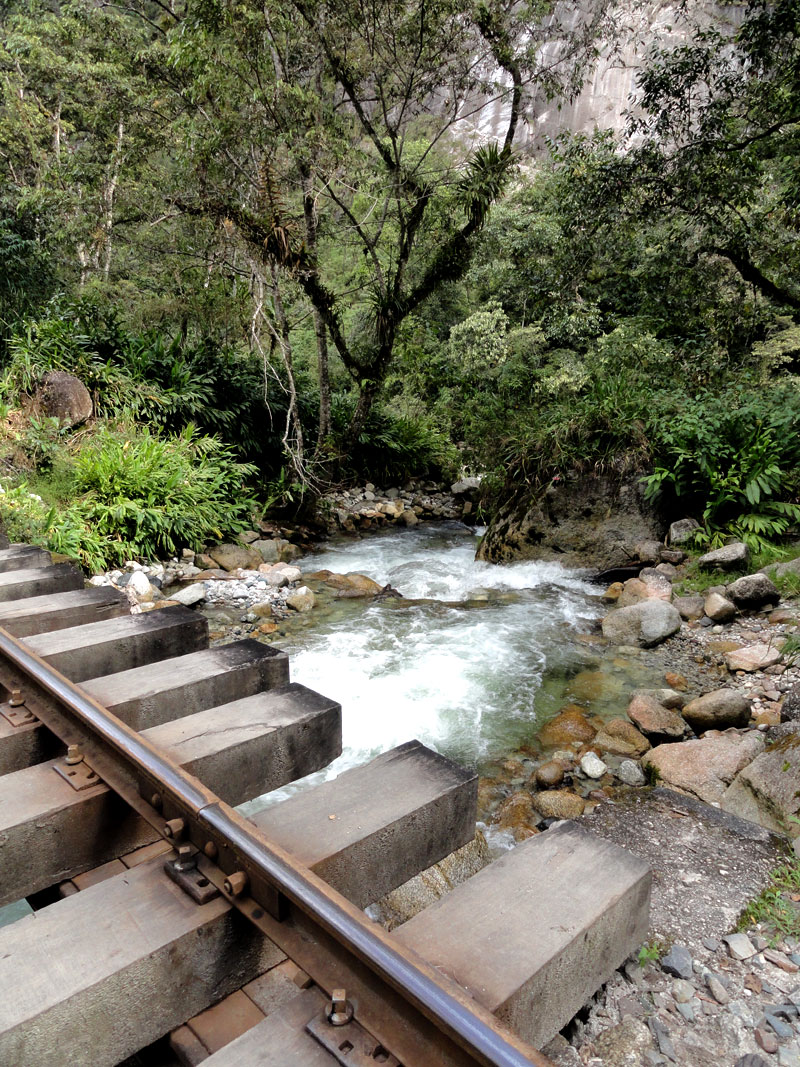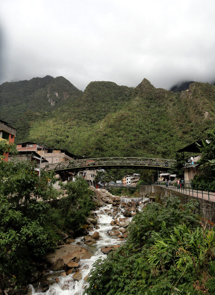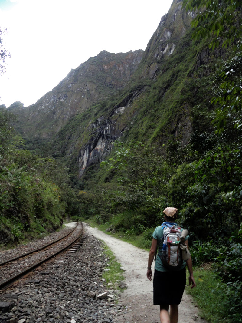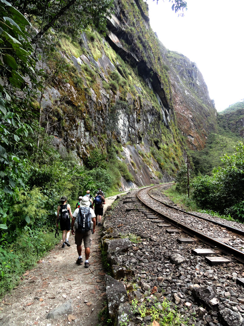 En la tarde nos despedimos a los chefs y los arrieros y salimos por camino a Aguas Calientes. Seguimos la vía férrea y el río nos acompañamos también. Después de los días previos de caminar, mis piernas fueron lastimadas y mi rodilla tuvo dolor también, y por una razón esta caminata pareció durar más tiempo que yo esperaba.  Pero, las vistas de las montañas que rodean el pueblo más cerca de Machu Picchu fueron impresionantes y el Río  Urubamba nos acompañó por la mayoría del camino. Juancito nos mostró los pequeños edificios  de las ruinas encima de la montaña de Machu Picchu.