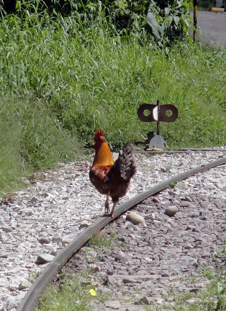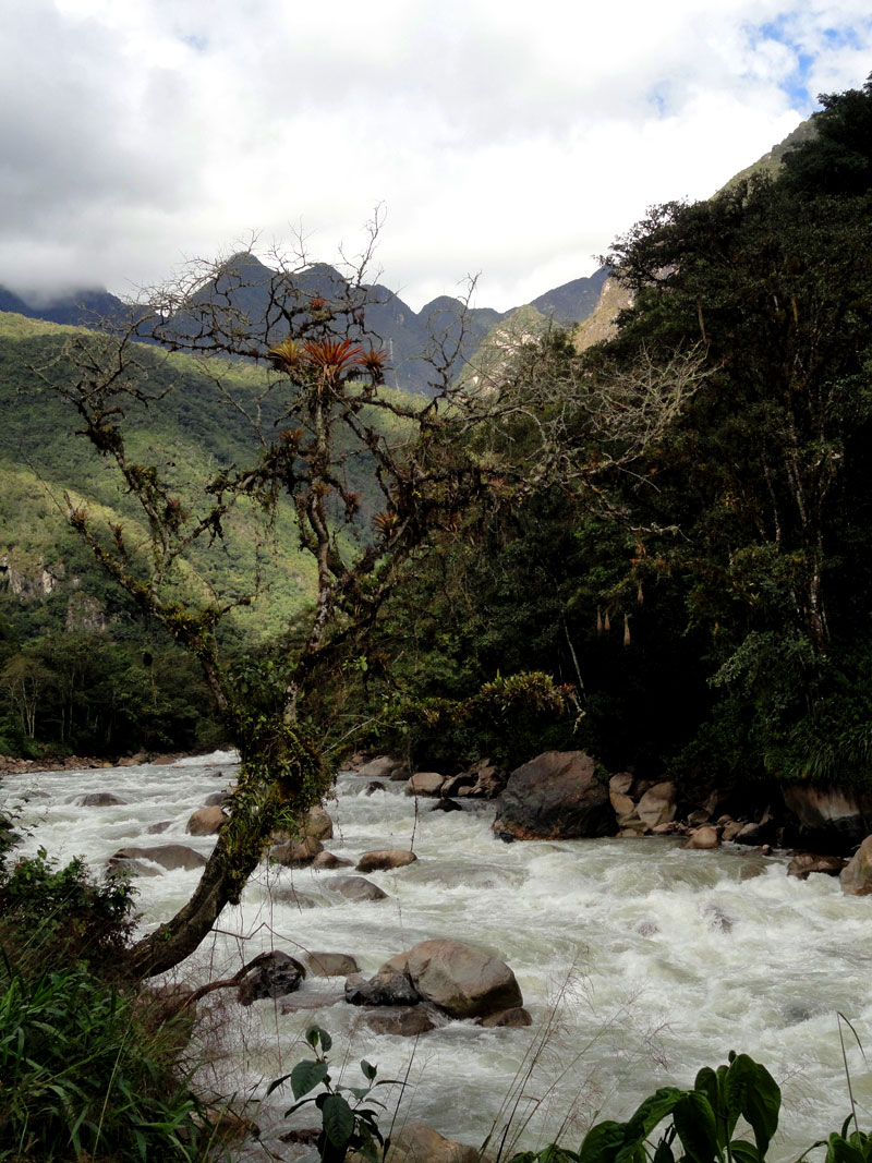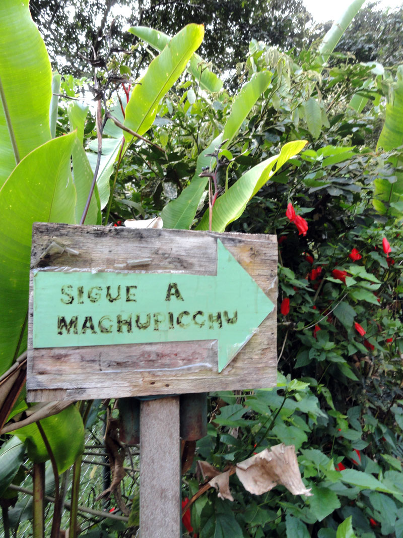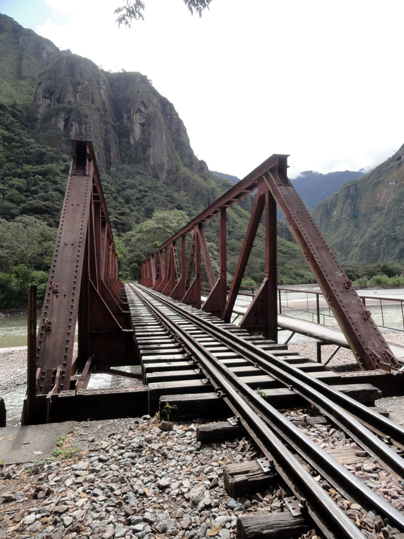 En la tarde nos despedimos a los chefs y los arrieros y salimos por camino a Aguas Calientes. Seguimos la vía férrea y el río nos acompañamos también. Después de los días previos de caminar, mis piernas fueron lastimadas y mi rodilla tuvo dolor también, y por una razón esta caminata pareció durar más tiempo que yo esperaba.  Pero, las vistas de las montañas que rodean el pueblo más cerca de Machu Picchu fueron impresionantes y el Río  Urubamba nos acompañó por la mayoría del camino. Juancito nos mostró los pequeños edificios  de las ruinas encima de la montaña de Machu Picchu.