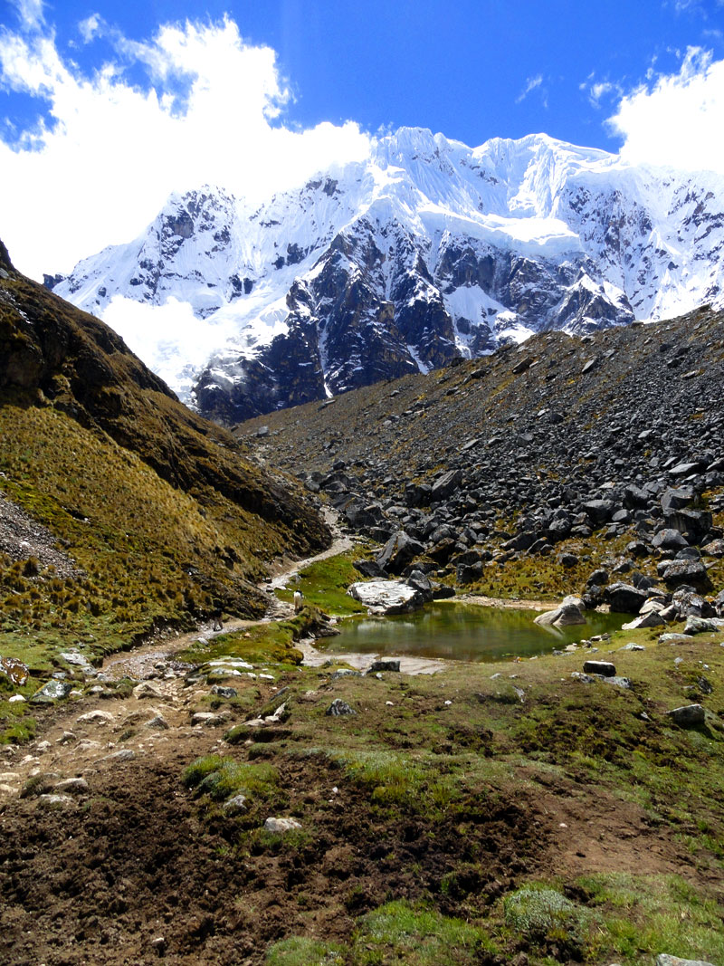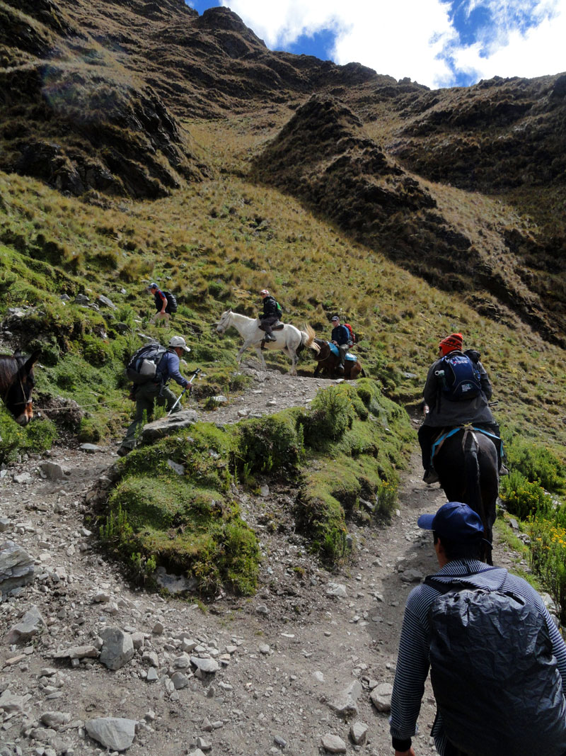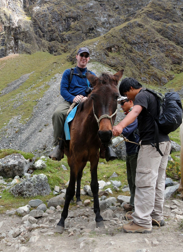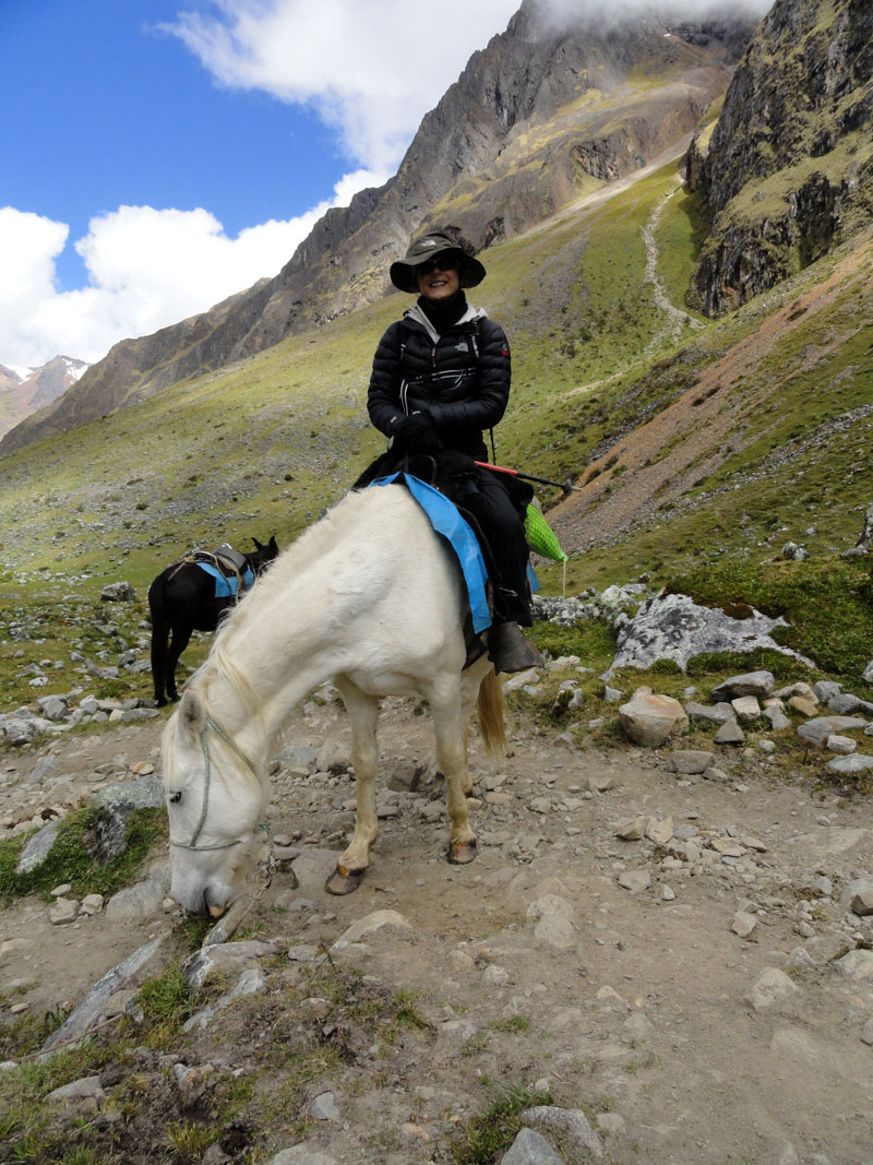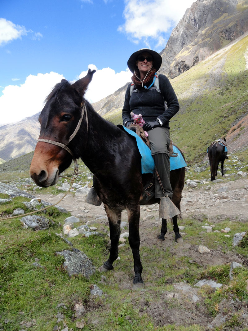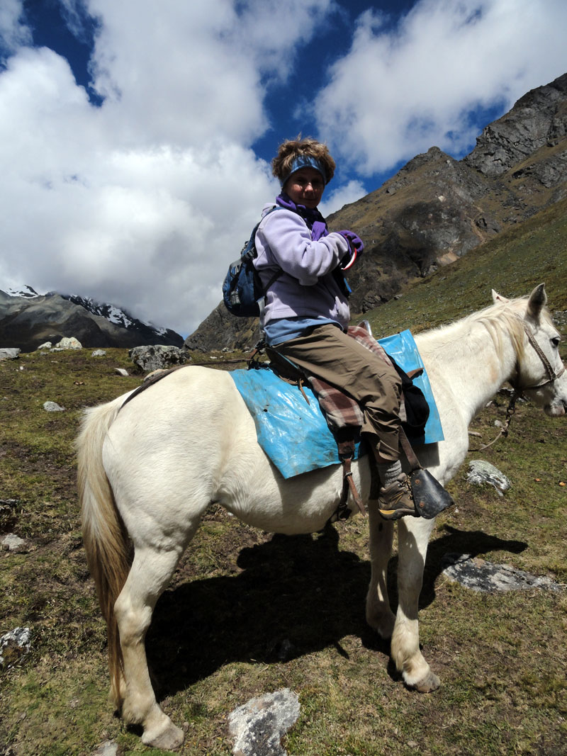 Desafortunadamente para mí, la parte de que estoy bien es la subida, y a causa del tiempo hemos perdidos en la mañana con un empiezo lento, tuvimos que montar los caballos para subir las pendientes. Los caballos fueron muy divertidos y podía sacar muchas fotos de las otras personas, de las montañas y las vistas muy peruanas y perfectas.  El punto más alto de nuestra caminata fue a 4600m (15091 pies) y se llama Salkantay Umantay. En este punto, Juan nos dijo sobre las tradiciones de los Incas y las locales, y hicimos un ofreciendo para Pachamama.  Salkantay es el segundo punto más alto en la región de Cusco y tiene una altura de 6264m (20551 pies).  Al punto más alta para nosotros, Jane se sintió terrible y incluso yo tuve dolor de cabeza.