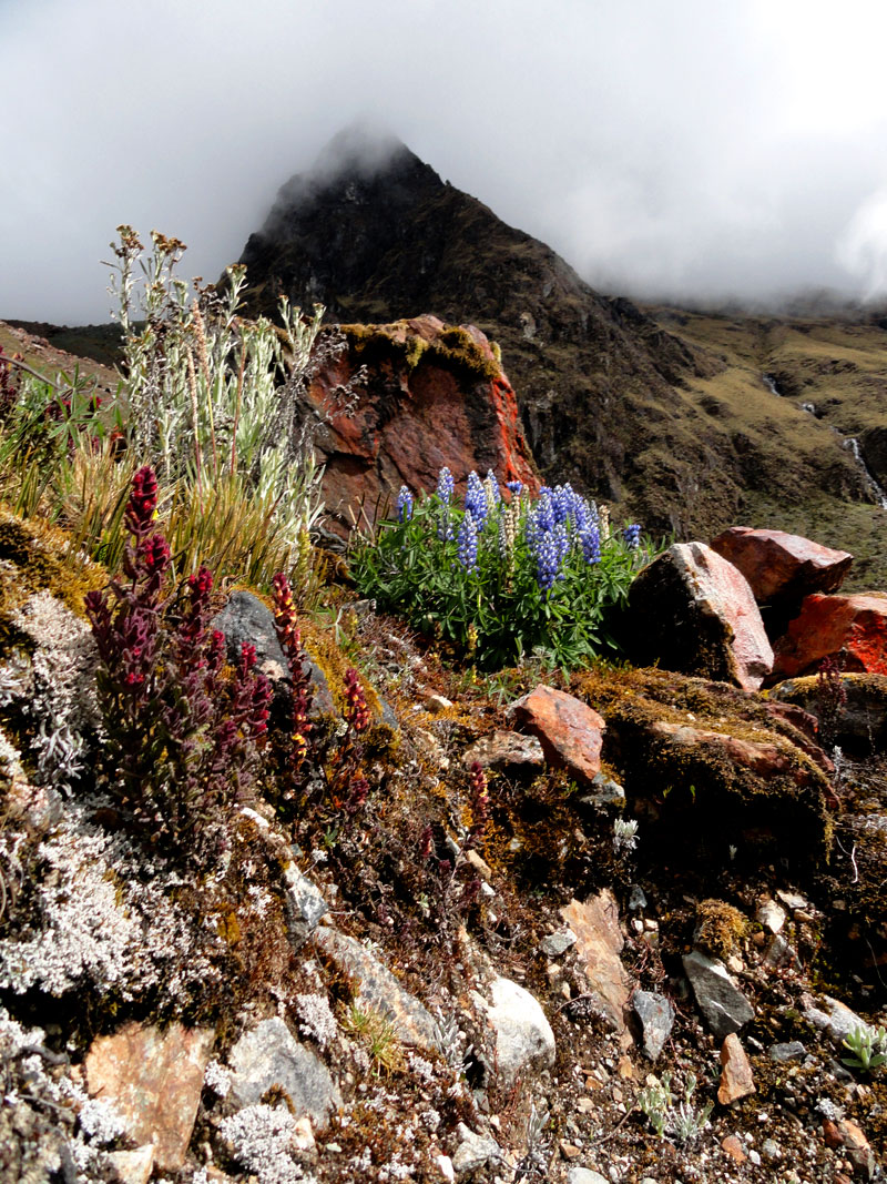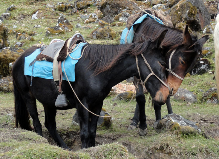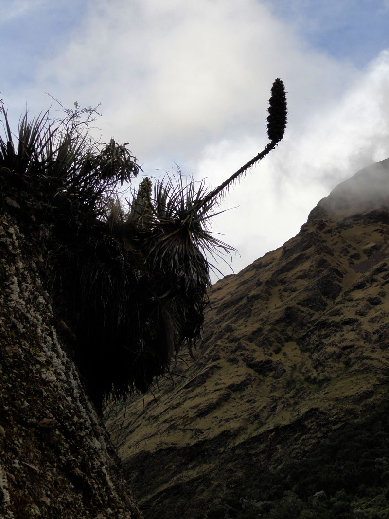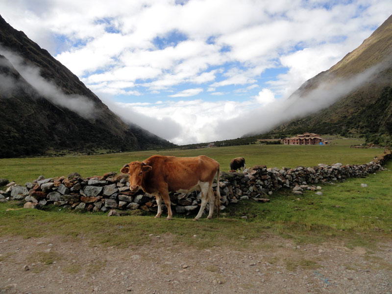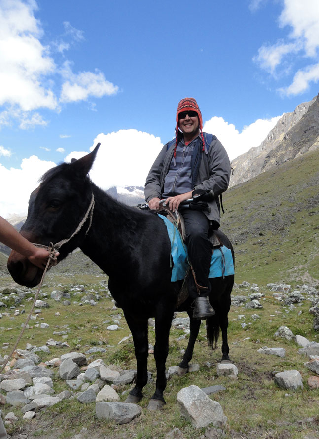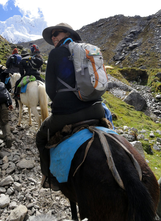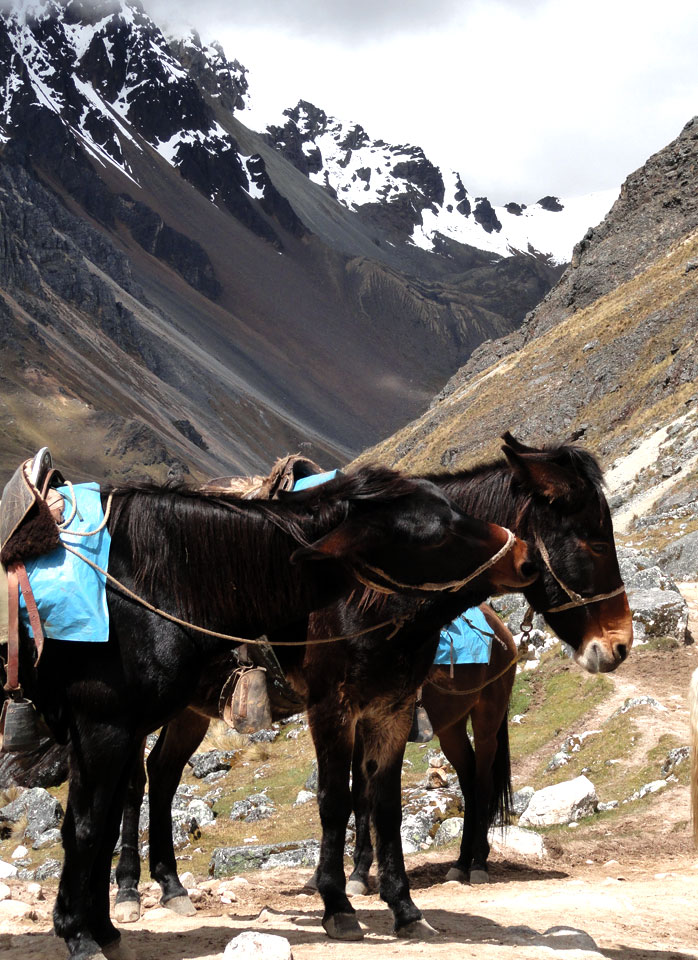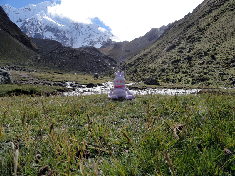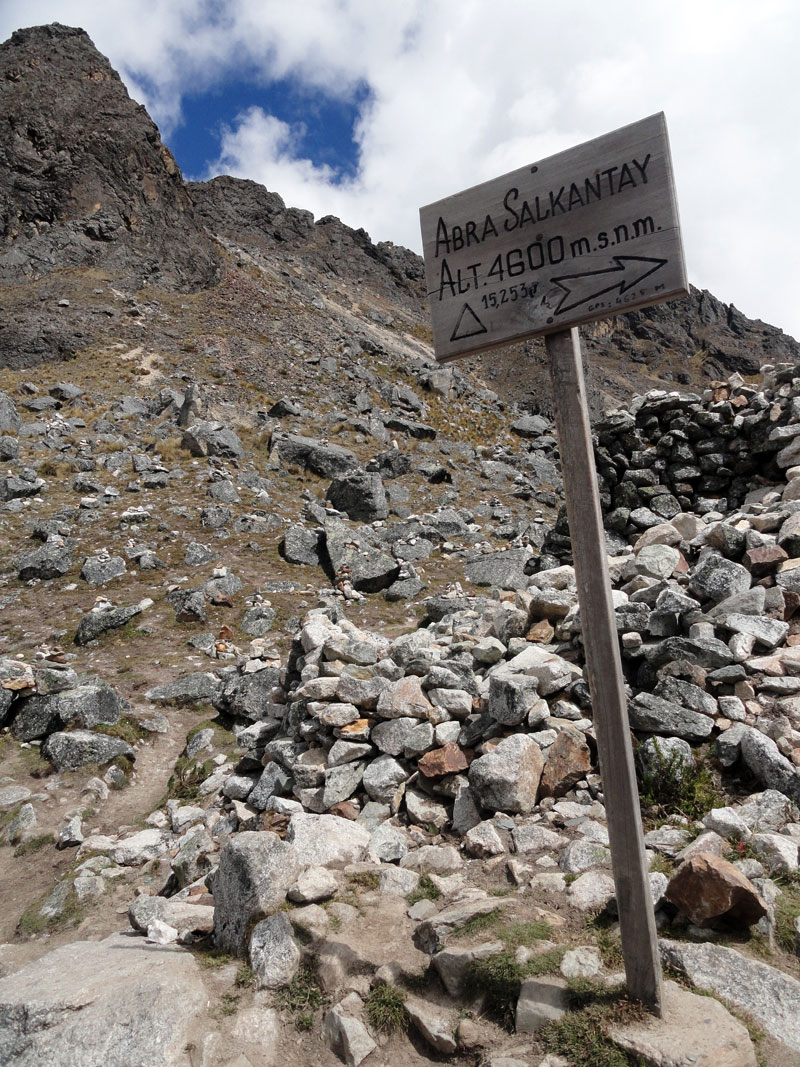 Desafortunadamente para mí, la parte de que estoy bien es la subida, y a causa del tiempo hemos perdidos en la mañana con un empiezo lento, tuvimos que montar los caballos para subir las pendientes. Los caballos fueron muy divertidos y podía sacar muchas fotos de las otras personas, de las montañas y las vistas muy peruanas y perfectas.  El punto más alto de nuestra caminata fue a 4600m (15091 pies) y se llama Salkantay Umantay. En este punto, Juan nos dijo sobre las tradiciones de los Incas y las locales, y hicimos un ofreciendo para Pachamama.  Salkantay es el segundo punto más alto en la región de Cusco y tiene una altura de 6264m (20551 pies).  Al punto más alta para nosotros, Jane se sintió terrible y incluso yo tuve dolor de cabeza.