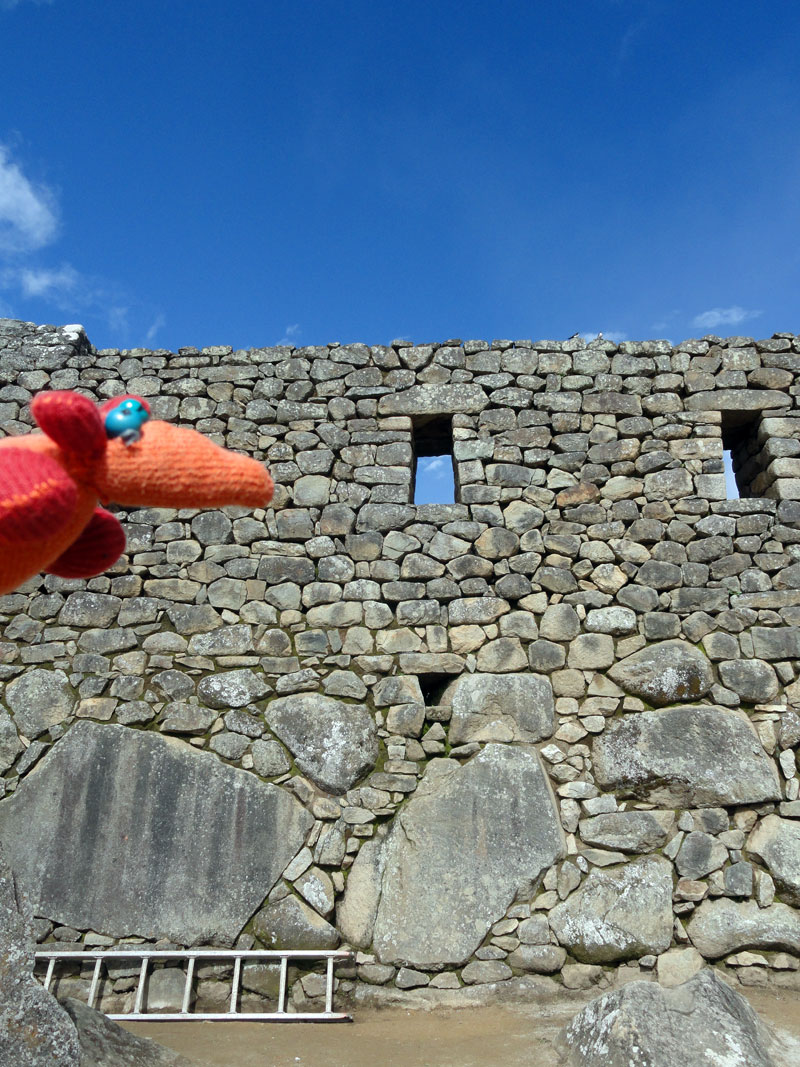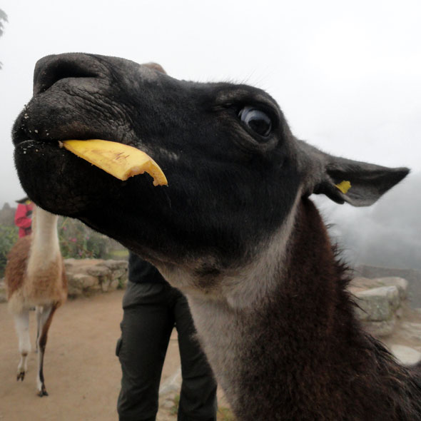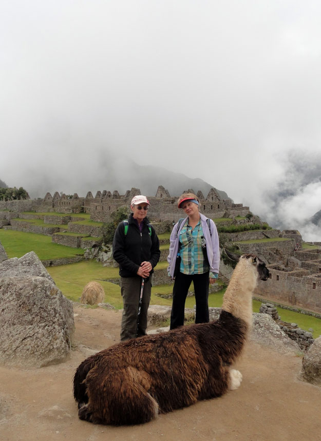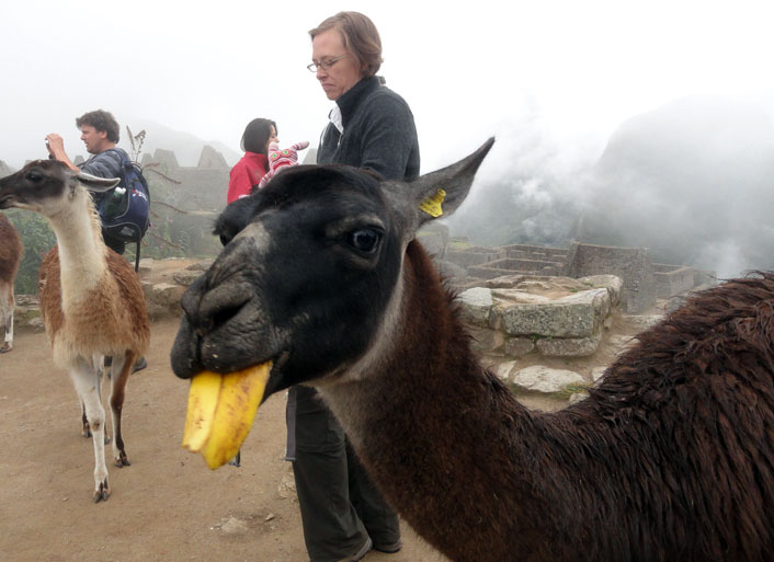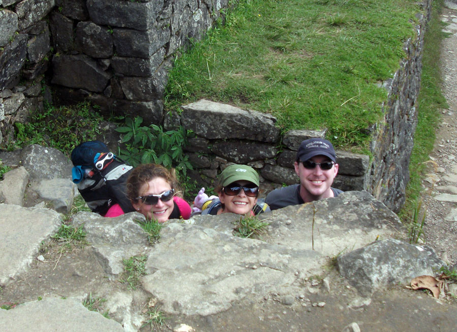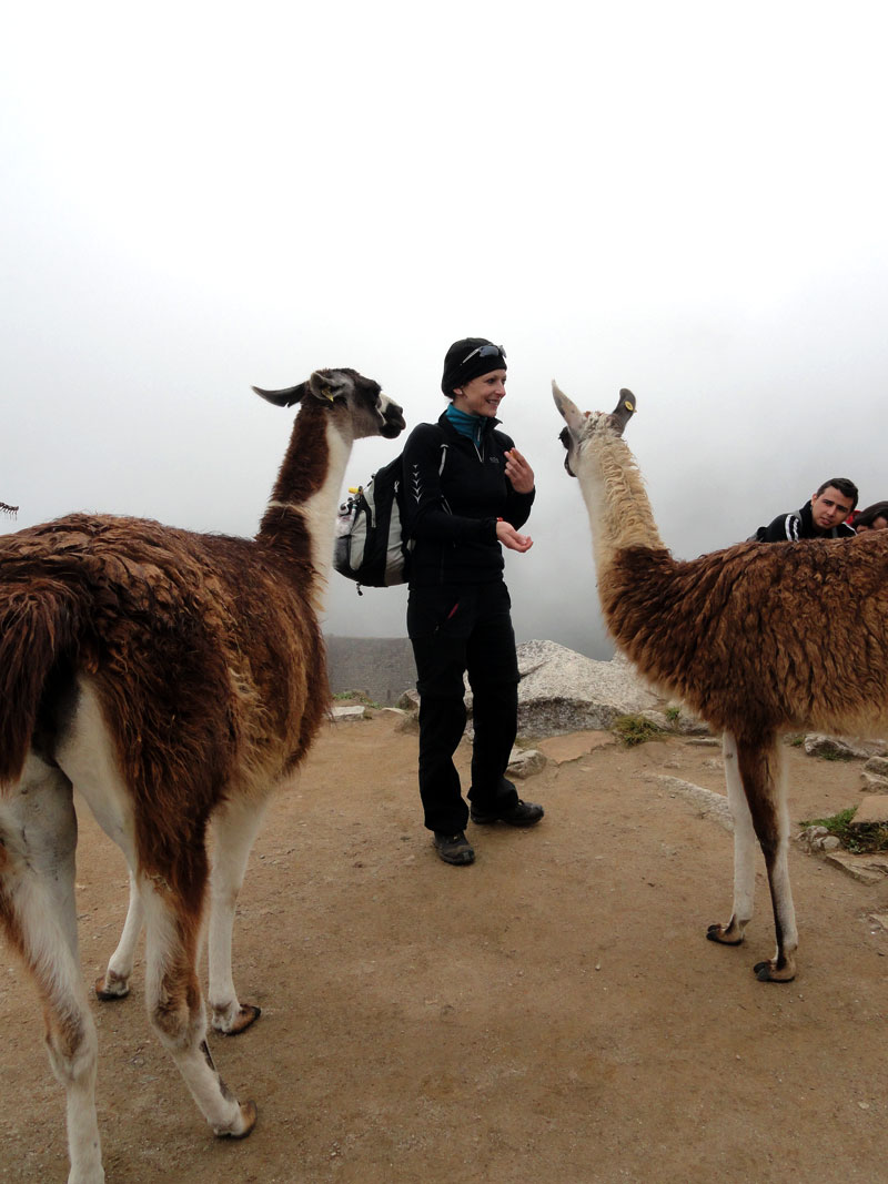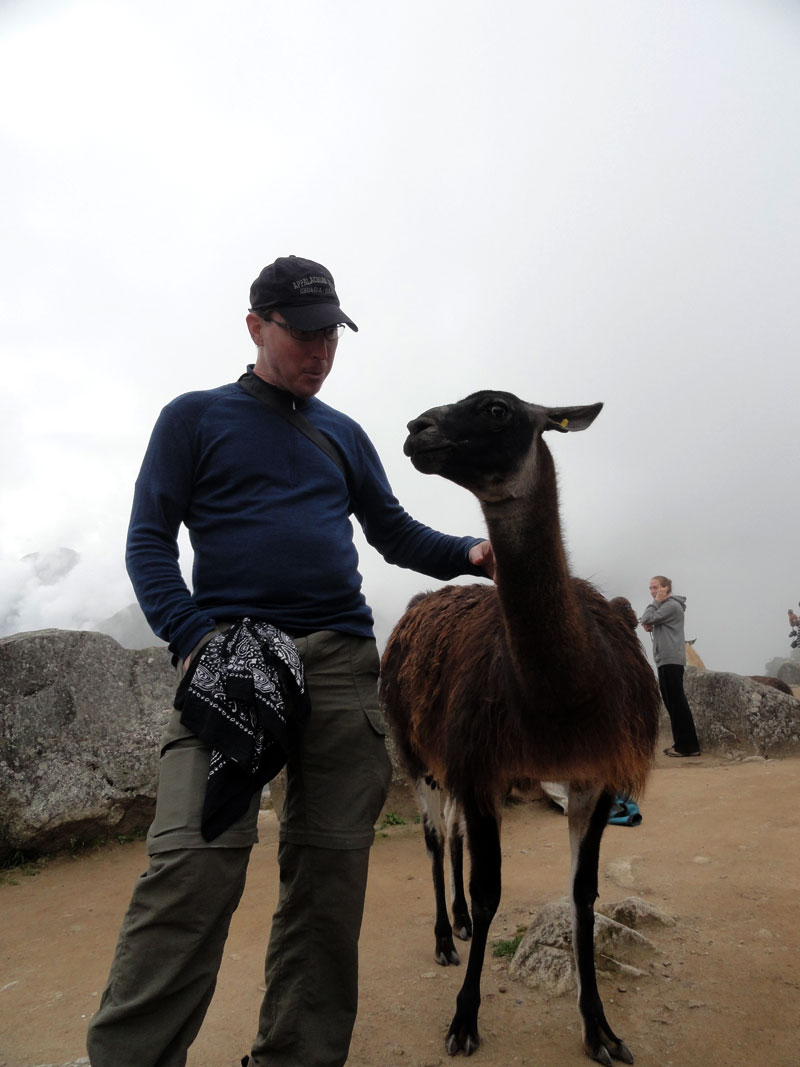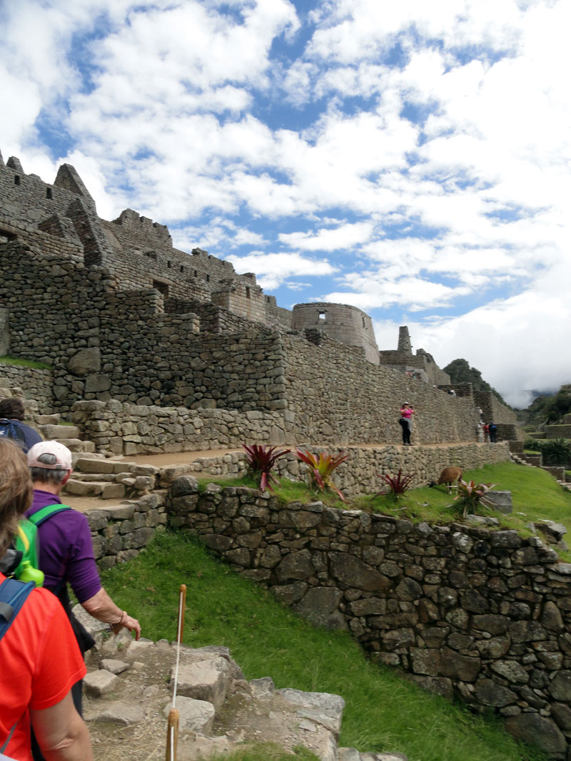 Como llegamos a la entrada, reconocíamos a Arlo, empapado en sudor de su caminata, y todos nos poníamos a la cola.  Una vez que estuvimos adentro el parque de Machu Picchu, Juan nos avisó que no hubo baños salvo los que fueron afuera.  Ese asunto nunca salió de mi mente mientras caminábamos por Machu Picchu,  observando las estructuras increíbles, enladrillado impresionante y llamas lindas, intentando no beber el agua o coca cero en mi bolsa durante la gira dado por Juan.