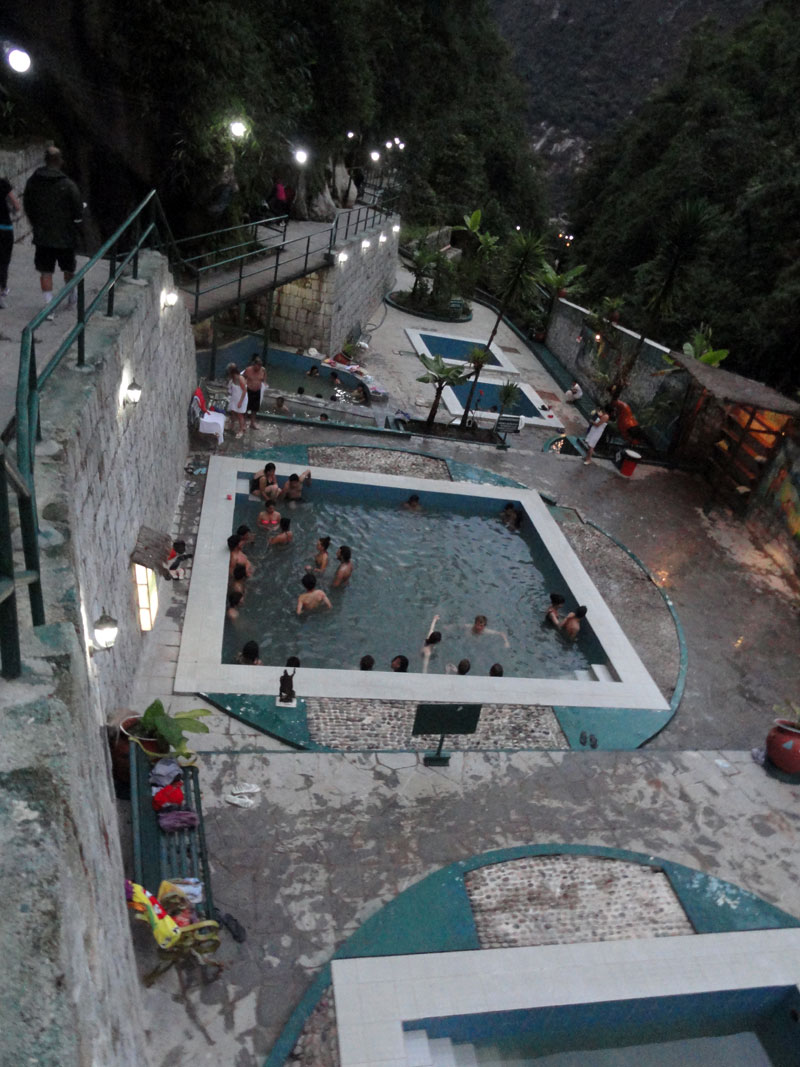 Antes de cenar, otra vez subimos en el bus de fiesta hasta algunos baños termales que fueron muy ricos.  Hubo 3 piscinas: uno fue poco profundo;, uno fue muy caliente pero tuvo los gringos principalmente, y la tercera fue poco menos caliente y allá hubo la mayoría de los peruanos, incluido nuestro grupo de arrieros, chefs, etc: Juan, Raúl, Cesár, Pedro y Samuel.  El agua fue muy rica en mis músculos, y fue la primera vez en tres días cuando me sentí limpio. Después de relajar, jugamos “tig” (al corre que te pillo) y Juancito y Raúl se unieron el juego.  Después me sentí poco triste – amo los peruanos y el paisaje en esa país. Ahorita, al tiempo de escribir, estoy triste también porque estoy en avión en el aeropuerto de Lima escuchando el mensaje de seguridad antes de despegar y llegar a Miami.  Miré los arrieros y otros jugando en la piscina. Fue la última noche con este grupo de jóvenes.