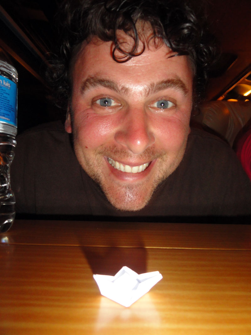 Todos nos encontramos en la estación de los trenes y tomamos el tren de Aguas Calientes a Ollantaytambo.  Estaba oscuro por eso no podíamos ver el río ni las montañas.  Matthew, Jane y yo hicimos barcos de papel y otros juguetes de papel (por ejemplo, un aparato que niñas usan para que predecir el porvenir de los otros).