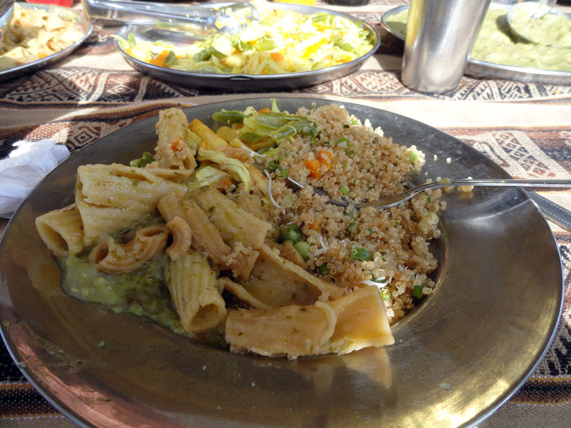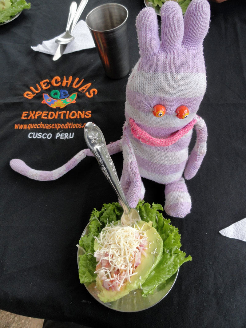 Después de aproximadamente 3 horas, paramos para almorzar en Sayllacancha donde nuestros chefs y arrieros estaban preparando una comida ricísimo. Hubo mucha comida pero me gustó especialmente la palta que tuvo una mezcla de cebollas, tomates y otros ingredientes ricos.