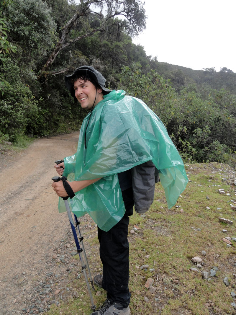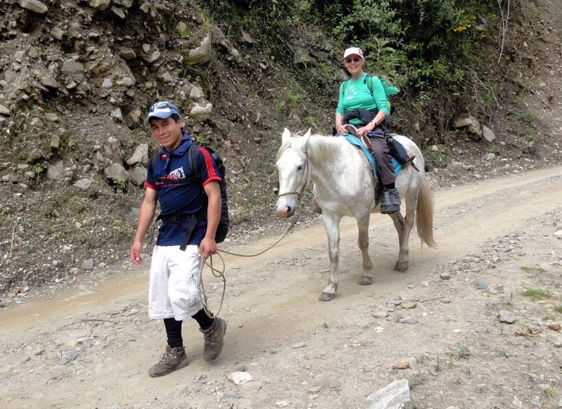 Lo peor fue que después de este punto todo fue cuesta abajo y necesité caminar despacio a causa de mis rodillas. Me sentí como un lisiado, pero por lo menos las vistas fueron maravillosas y, con nuestro grupo, siempre hubo una persona que fue conmigo.  Aparentemente fuimos muy lento hasta con el ayudo de los caballos en los pendientes, y por eso Juan tuvo que mover nuestro campamento una hora más cerca.  Bajamos por la selva de lluvia y vimos muchos panoramas distintos y hermosos. Cuando llegamos en nuestro campamento en la noche, estaba oscuro y fue poco difícil para preparar por la noche. Aquella noche compartí una carpa con Jane, quien se sintió mejor con la altura baja.