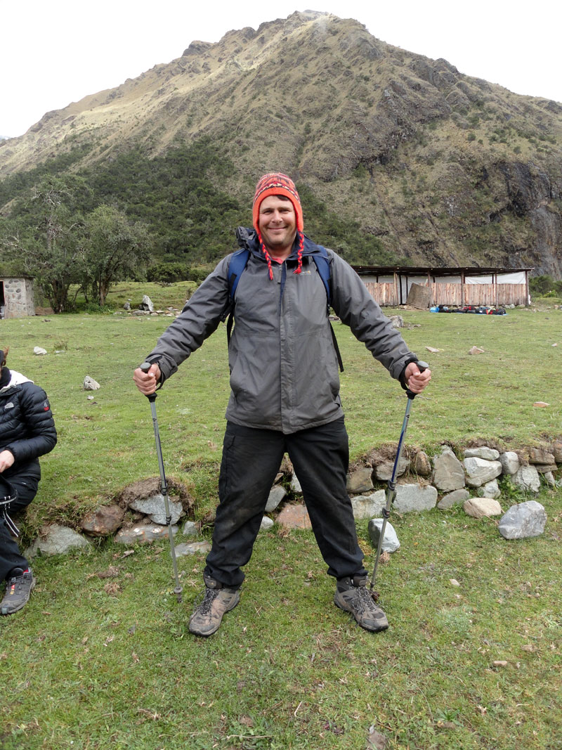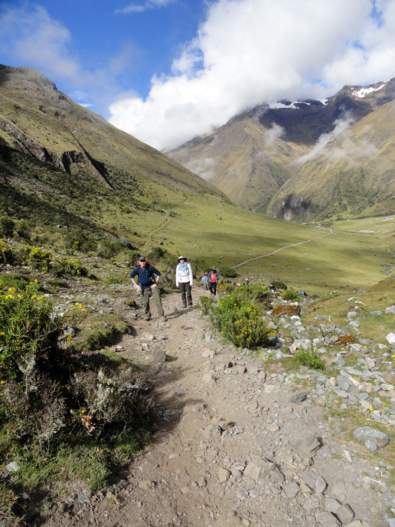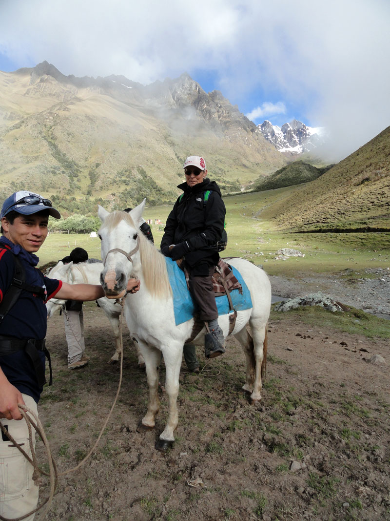 Jane, quien sufrió de los síntomas de la enfermedad de altura, fue muy mala y como subimos de 2900m a 3850m (12,600 pies), ella empeoró.  Juan intentó curar sus síntomas con remedias locales pero en eso momento ella sufrió también con una migraña y los remedias no fueron útiles.  Hace la última hora, Matthew y yo tuvimos que caminar con ella porque fue tan débil. Ella necesitaba dormir mucho pero la distancia siempre pareció muy larga y a veces Jane acostaba en el lado del camino para se caería.  También montó en su caballo pero mareó y nos preocupamos que descendiera.  Por fin llegamos a Soraypampa y las carpas estaban listas. Jane entró su carpa y el resto del grupo preparamos por una noche muy fría porque fue una altura muy alta a causa de la proximidad de la montaña Salkantay.