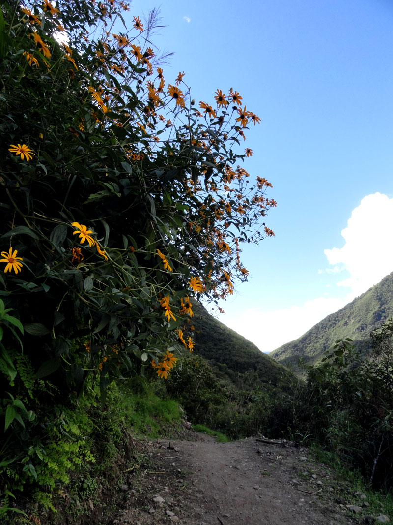 Hizo mucho calor cuando bajamos de la camioneta y todos necesitábamos cambiar nuestra ropa para la temperatura. Por supuesto, Chris desvistió casi toda su ropa para preparar. Luego empezamos caminar.  Las vistas de esta altura fue muy chéveres y Stacy y yo lo preguntamos a Juancito sobre los flores y la plantas lindos que vimos.