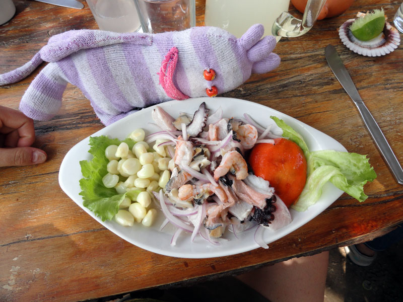 Después de explorar y sacar muchas fotos de la chacra y los dos monos de calcetines, fue tiempo para comer. Hubo una olla muy grande que contuvo el caldo de camarones (nombre oficial: chupe de camarones, un plato típico de Arequipa) que no solamente tiene camarones pero también: papas, leche, huevos, queso, otros pescados, choclos, calabaza (tal vez) y hubo una mezcla de cebollas picadas con pimientas muy picantes en un bol que se podía añadir a su caldo. Creo que es una de las experiencias gastronomias favoritas de mi visita. Fue ricísimo y muy diferente. Es poco similar a la “shrimp boil” en el sur de los Estados Unidos, pero con todos los ingredientes en un caldo, mezcladas con leche, queso y más…