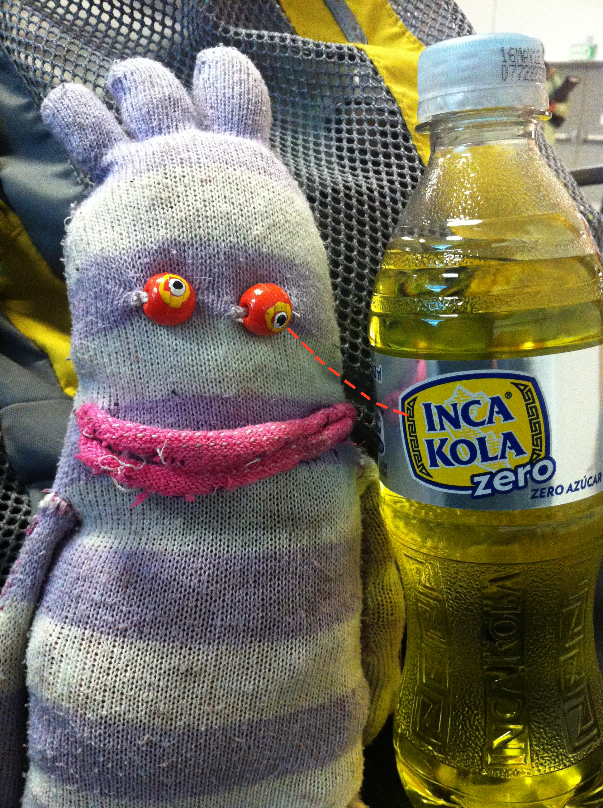 ¡OK! Todo está bien de nuevo. Estoy esperando mi vuelo en la puerta (14) y he recibido un texto de Cassandra. Tengo una “Inca Cola” (Cero) y Sock Monkey está muy contento. Esta Inca Cola (Cero) tiene cero calorías pero creo que tiene mucha cafeína porque me siento muy despierta.